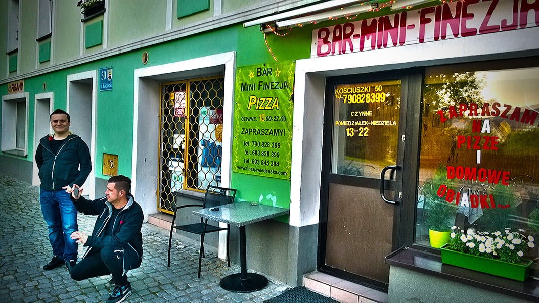 Jako, że tradycji musiało stać się zadość, wieczorkiem ruszyliśmy w poszukiwaniu czegoś do jedzenia. Wracając z Czech mignęły mi po prawej stronie jakieś stoliki – skierowaliśmy się więc w kierunku wylotu na Kletno. Niestety na nic nie natrafiliśmy. Zrezygnowani wracając trafiliśmy w centrum na Pizzerię u Prezesowej. Wystrój i wygląd lokalu był bardziej obiecujący, niż Mini Baru Finezja. Jak się później okazało, w lokalu podają świetną pizzę niewiele ustępującą włoskiemu oryginałowi. Zdecydowanie więc polecam ten lokal.