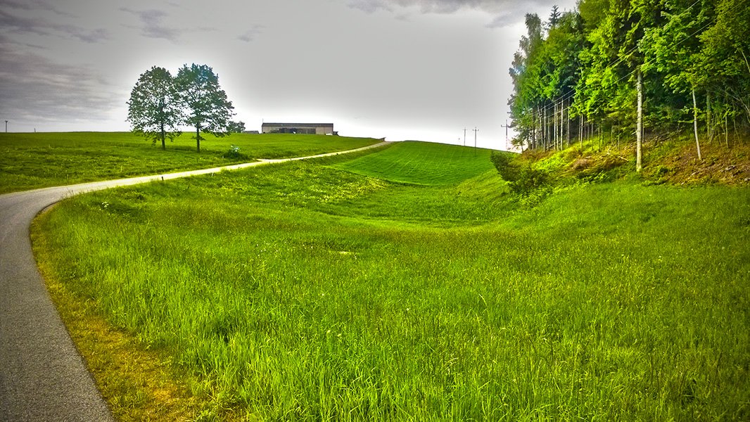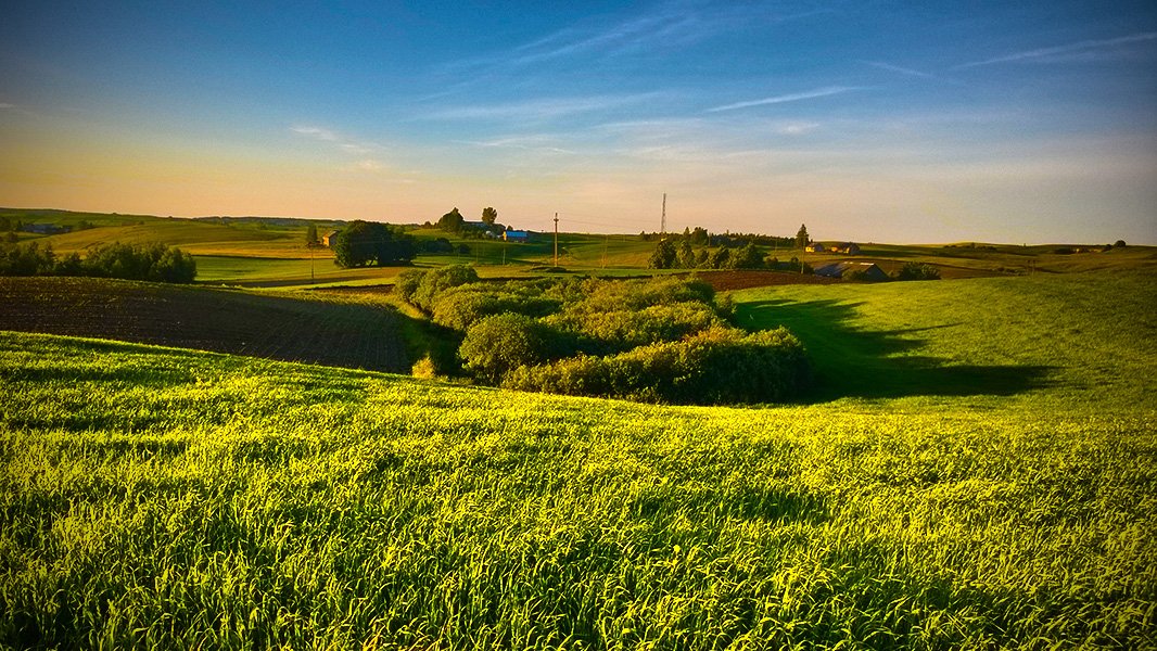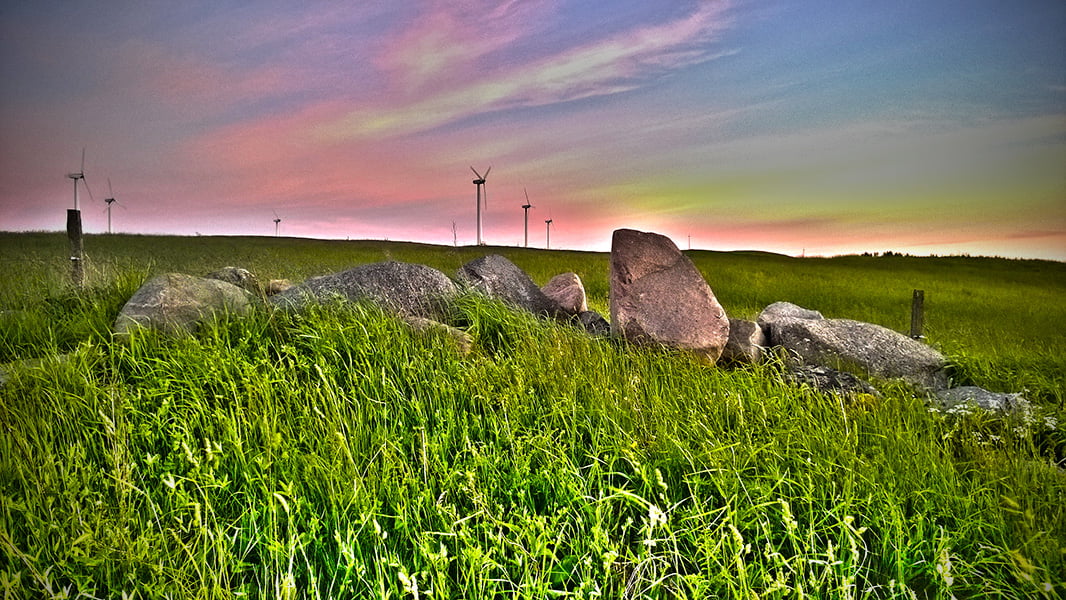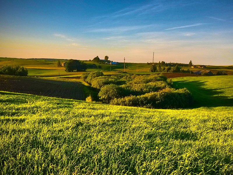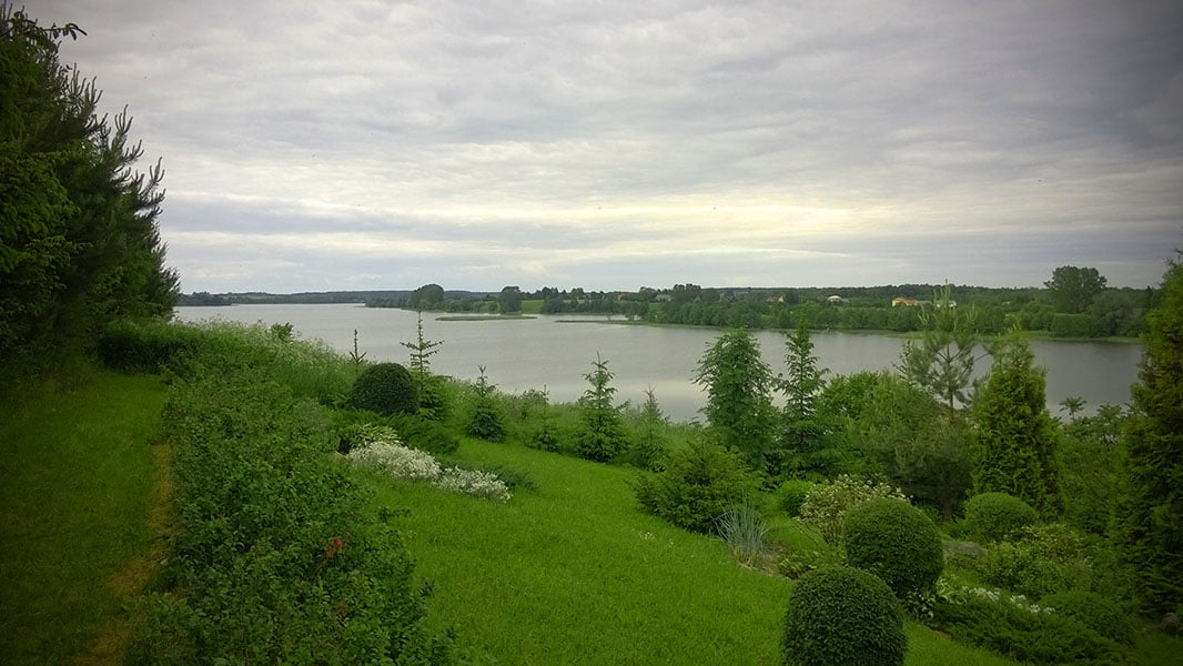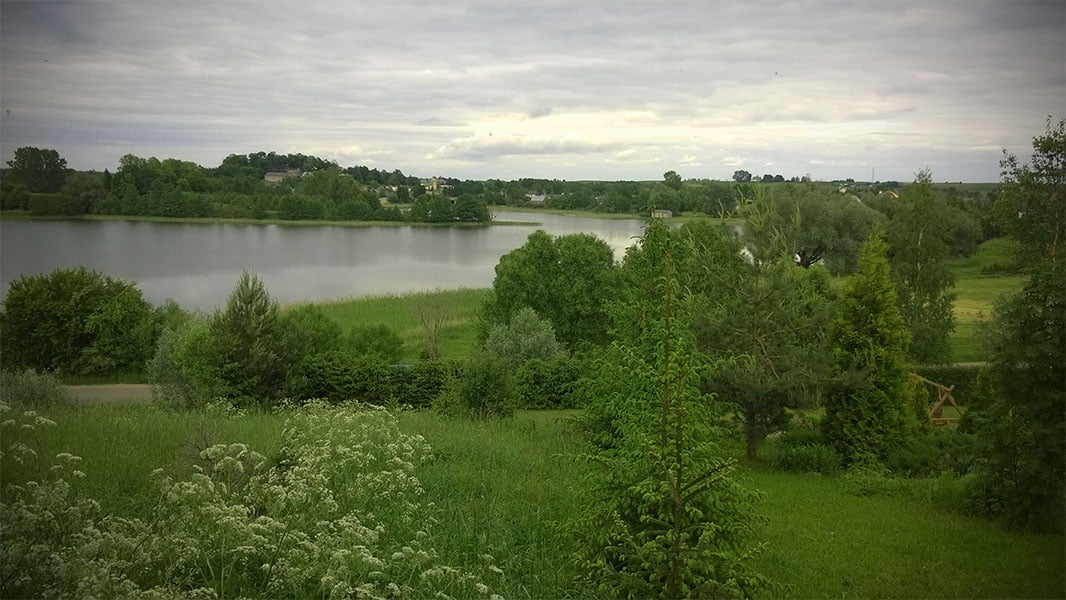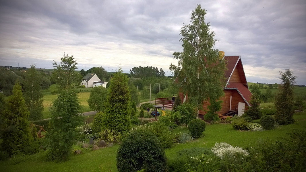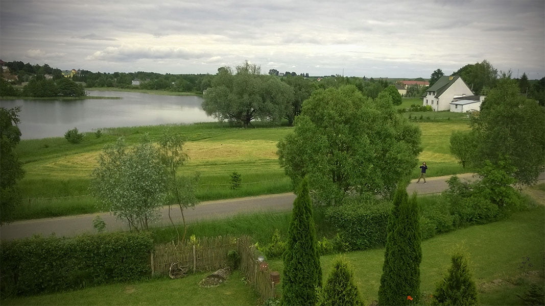Na wzgórzu na południu Wiżajn znajduje się elektrownia wiatrowa. Kierujemy się w tamtym kierunku i po 20 minutach jesteśmy u celu. Pomacane i lecimy dalej – na wschód. Według nawigacji powinniśmy przebić się na drugą stronę Wiżajn. Niestety w pewnym momencie droga kończy się na środku gospodarstwa wiejskiego. Podejmujemy decyzję – brniemy dalej – na horyzoncie widać drogę, ale przed nami trawa po pas. Kilkanaście minut i wychodzimy na kolejną wiejską drogę. Przechodzimy koło kolejnego gospodarstwa. Ludzie mają taki widok z okna, że zapiera dech – mieszkają na pagórku, a w dole widok na całe Wiżajny i jezioro oraz zachodzące słońce. Tu mógłbym się osiedlić.